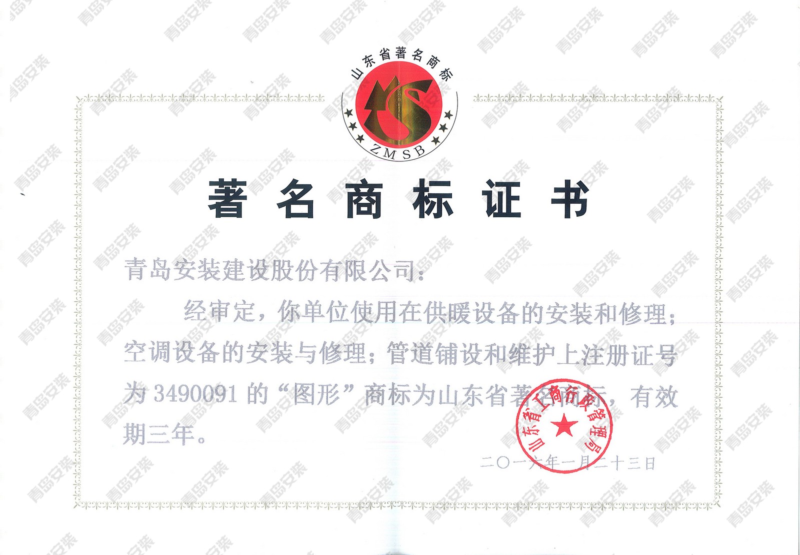 山東省著名商標(biāo)證書
